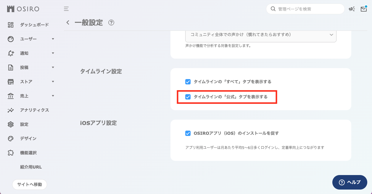管理ツール>設定>一般設定>タイムラインの設定>タイムラインの「公式」タブを表示する
