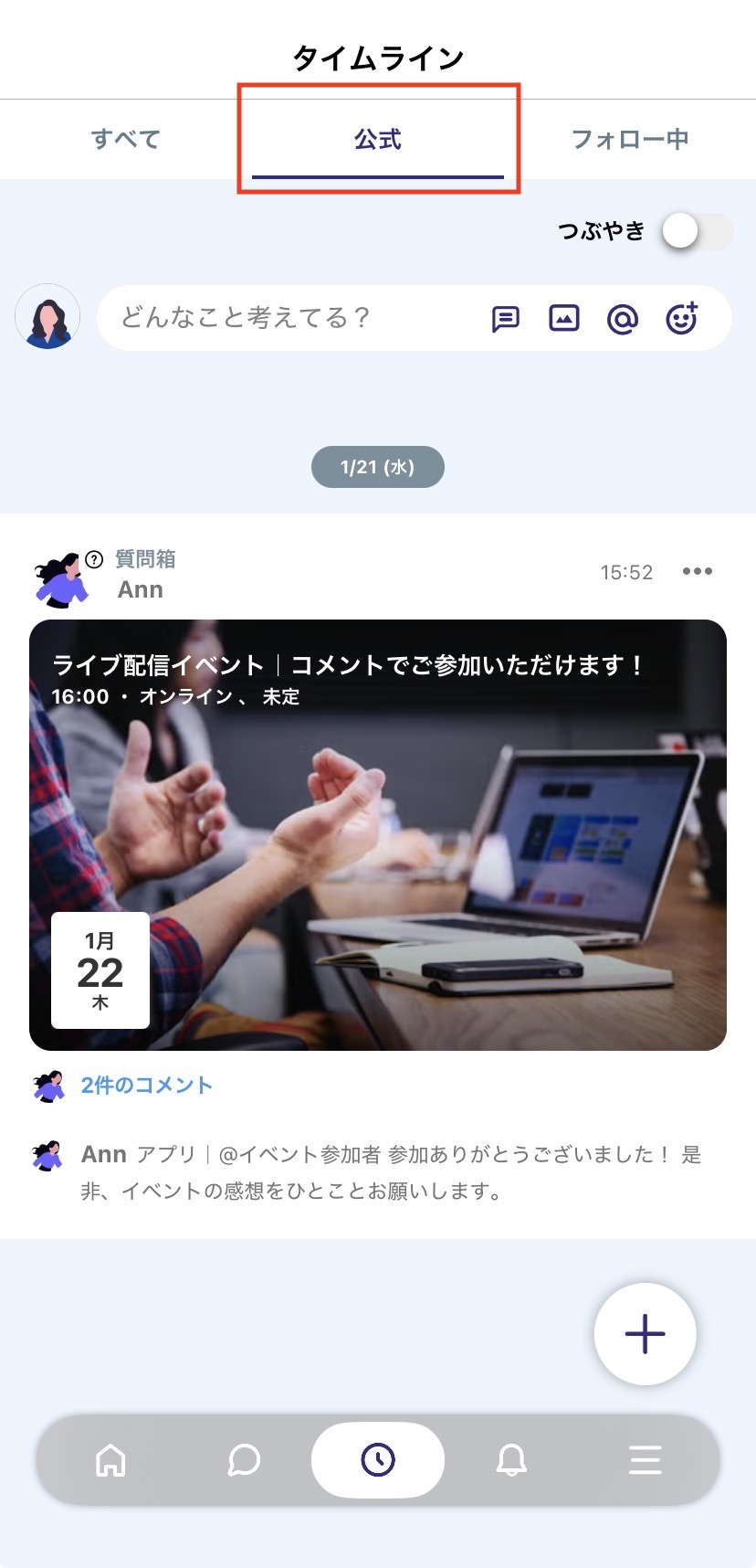 タイムラインに「公式」の投稿だけを表示させられる「公式」タブを追加することができます。
