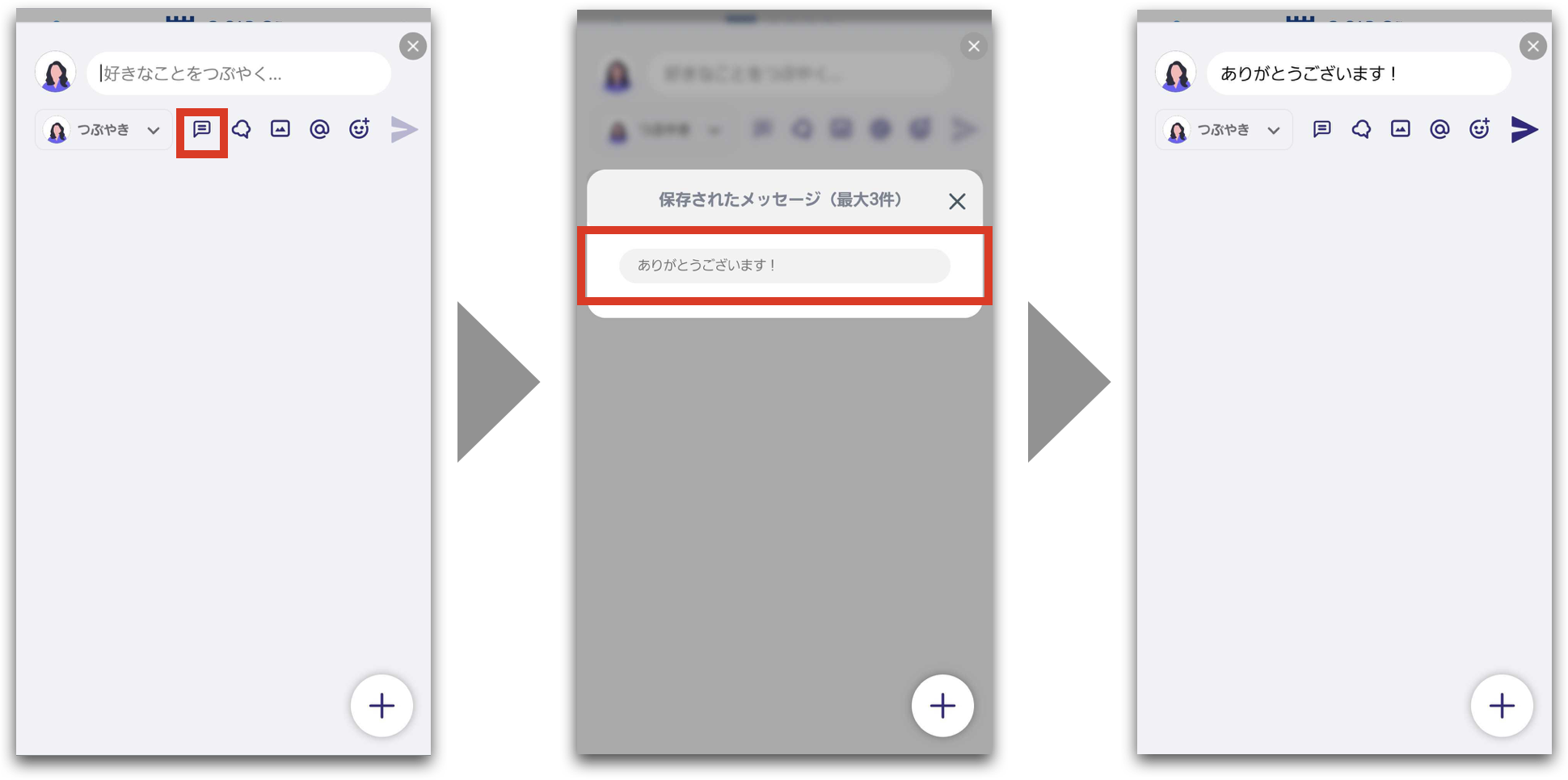 よく使うメッセージとは 2024年05月22日 12:05 更新 つぶやきやブログなどの投稿や返信時に、頻繁に利用したいメッセージを保存することができる機能です。 以下の箇所にて利用することができます。 つぶやき つぶやき、ブログ、コンテンツ、イベント、ストア、アトリウムなどのメッセージ投稿・返信