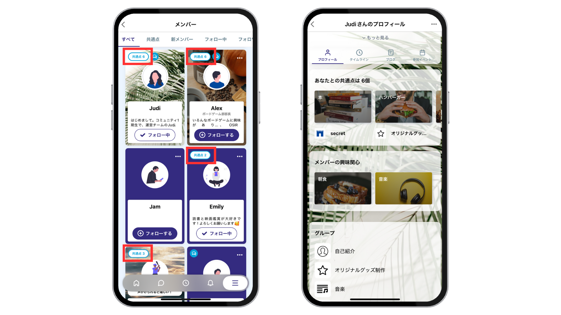 フォローするとプロフィールに表示され、他のメンバーとの共通点として集計されます。