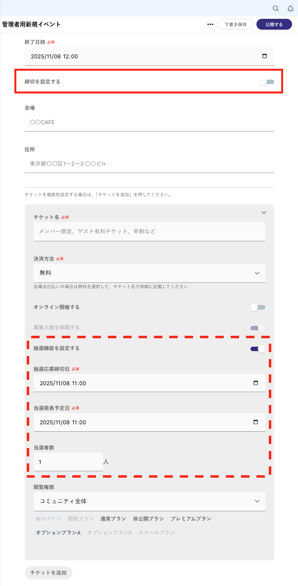 - 「抽選応募締切日」メンバーが応募できる期限を入力してください。