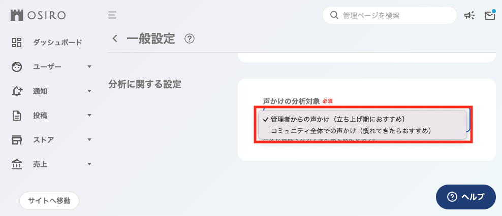 オーナーやコミュニティの状況に合わせて「声かけ」の分析対象を2パターンから選ぶことができます。