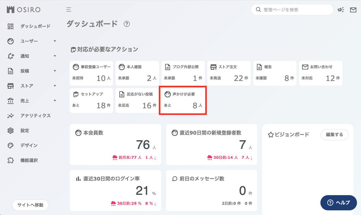 - 管理ツール|ダッシュボードから声掛けが必要なメンバーを把握できるようになります