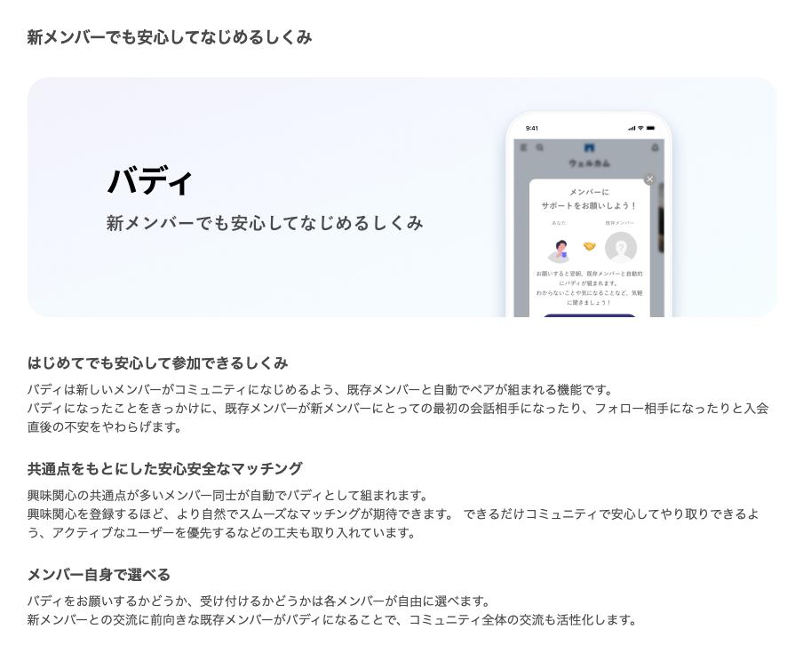 「バディ機能」とは、入会したばかりのメンバーと既存メンバーとの関わりのハードルを下げることを目的としたマッチング機能です。利用したことがないコミュニティはぜひこの機会にご活用ください。