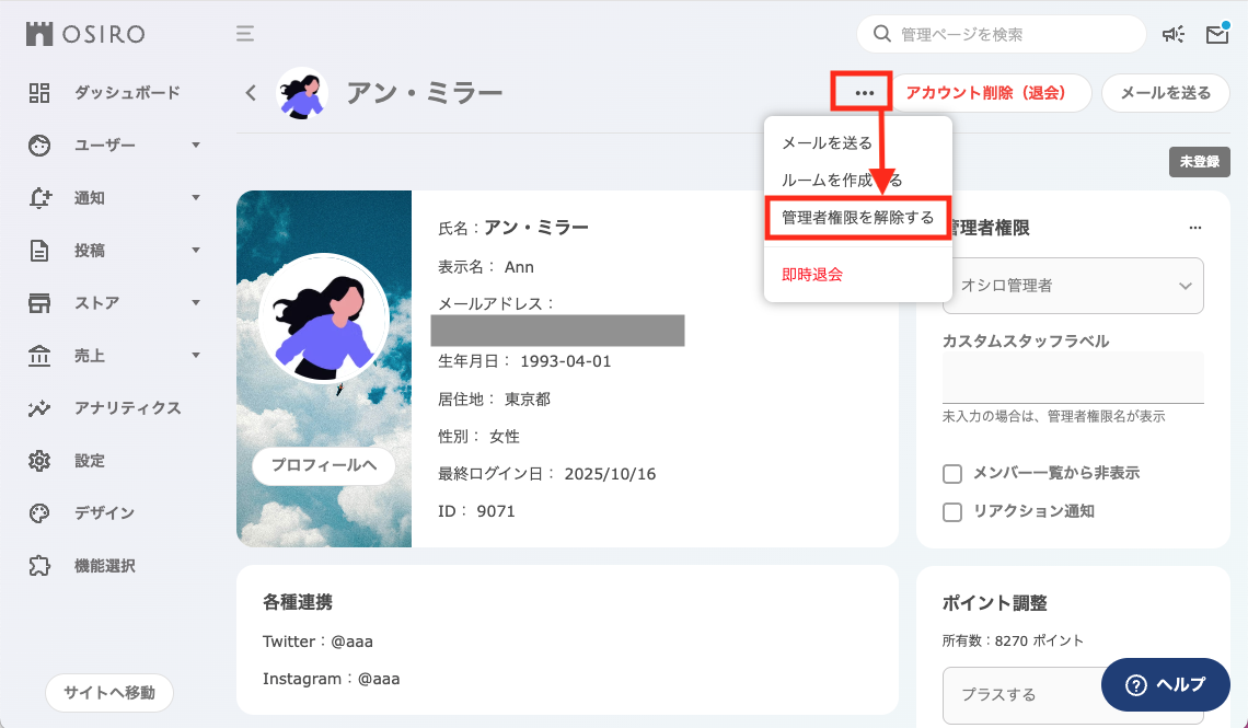 管理ツール>該当のメンバーの詳細ページ>三点リーダー>「管理者権限を解除する」