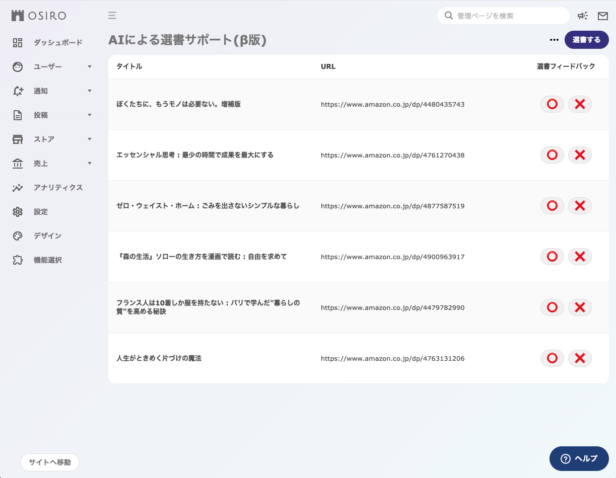 - フィードバックをすると次回以降選書する時に、フィードバックを反映した上での追加選書が行われます。