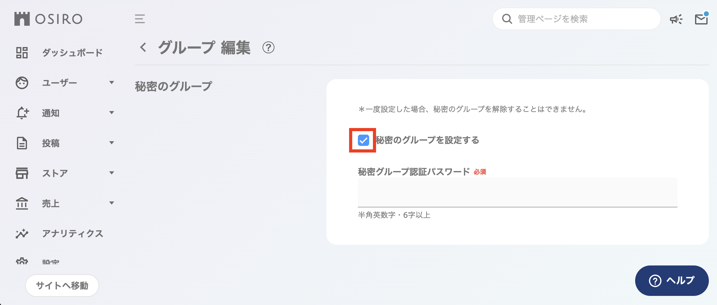 - 秘密のグループであってもサイト内通知「(グループ名)が作成されました!」は通知されます。