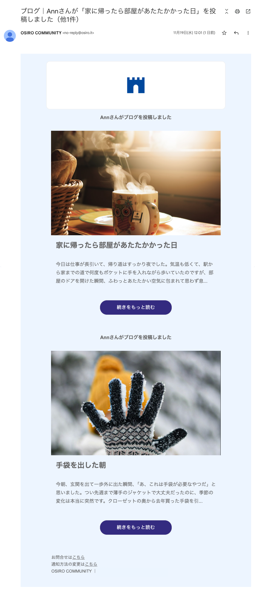 この度のリリースにより、「ブログ」と「イベント」が公開された時に届く通知がひとつのメールにまとまって届くようになります。