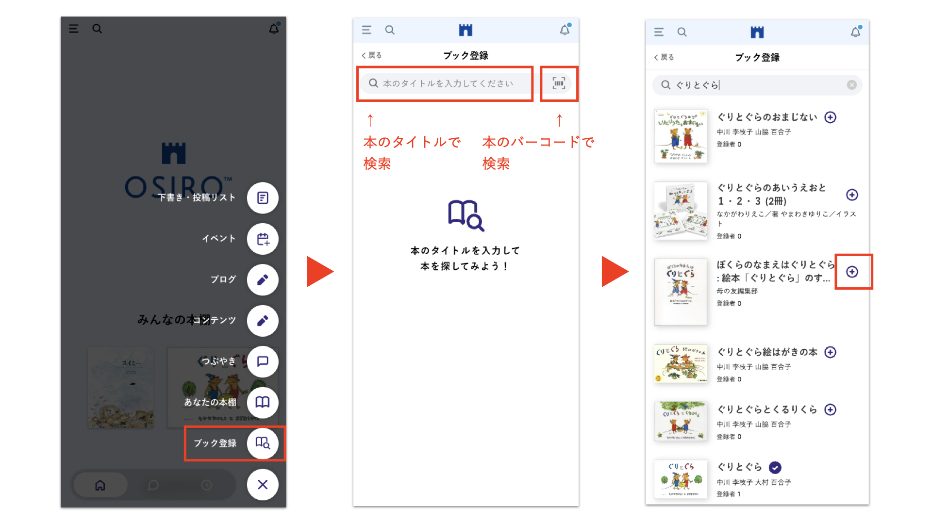 キーワード検索やバーコードでの検索で読みたい本や読んだ本を登録しておくことで、 後述する「本棚」や「みんなの本棚」に書影が表示されます。
