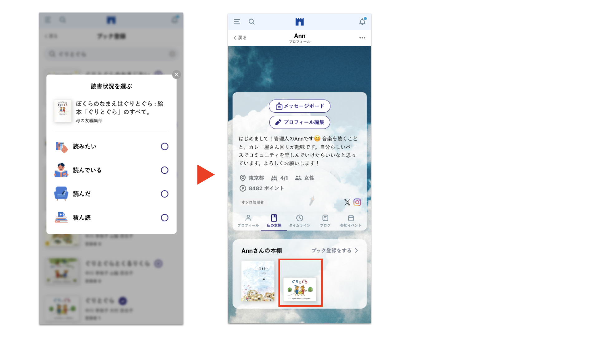 登録した本はプロフィールの「本棚」に表示されていきます。 読んでいる本や読みたい本を登録しておくことで他のメンバーからどんな人かを知ってもらうことができます。