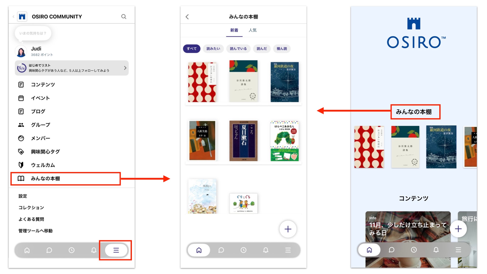 コミュニティ内に本を登録することができる、オンライン型の本棚機能です。