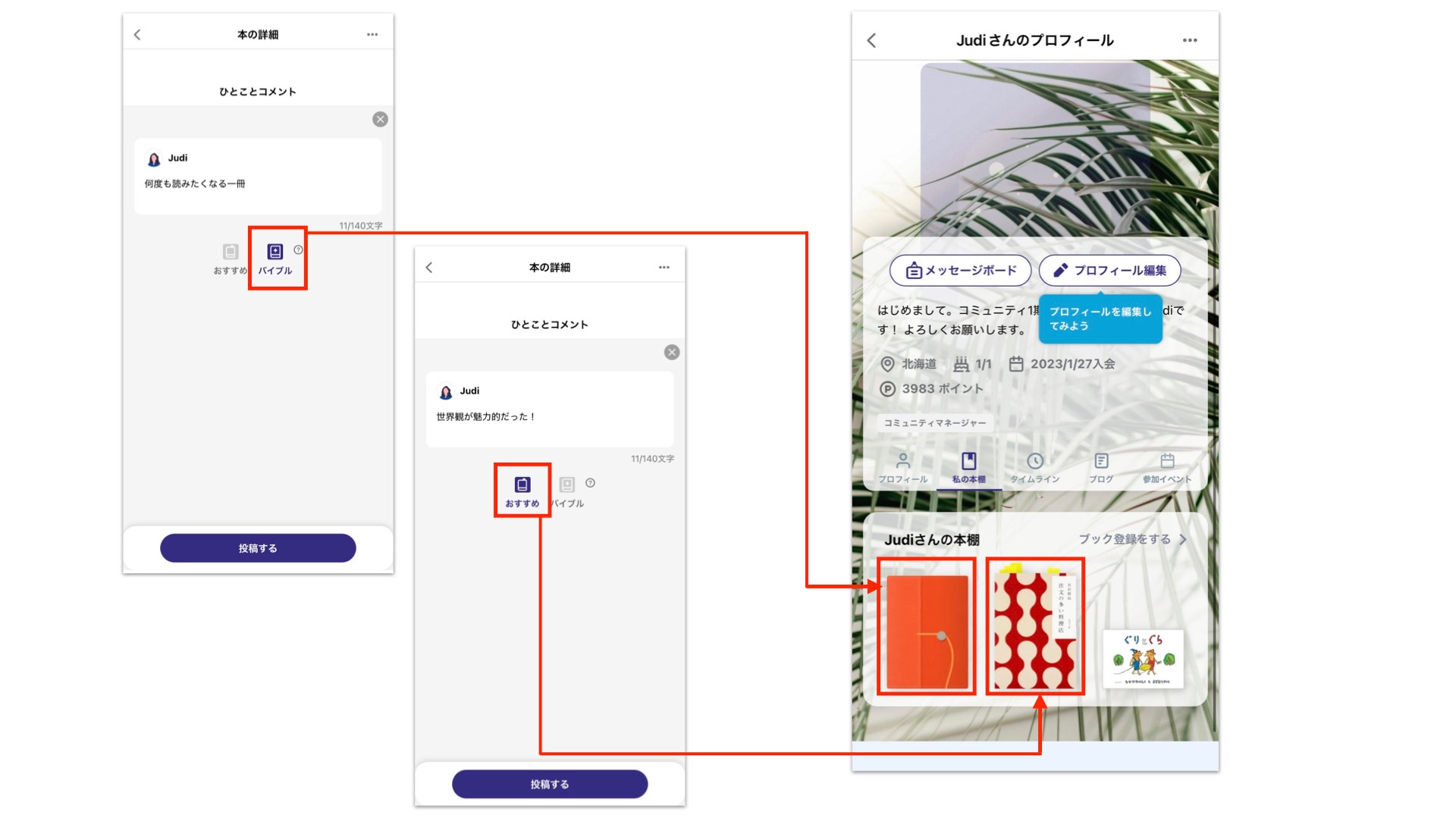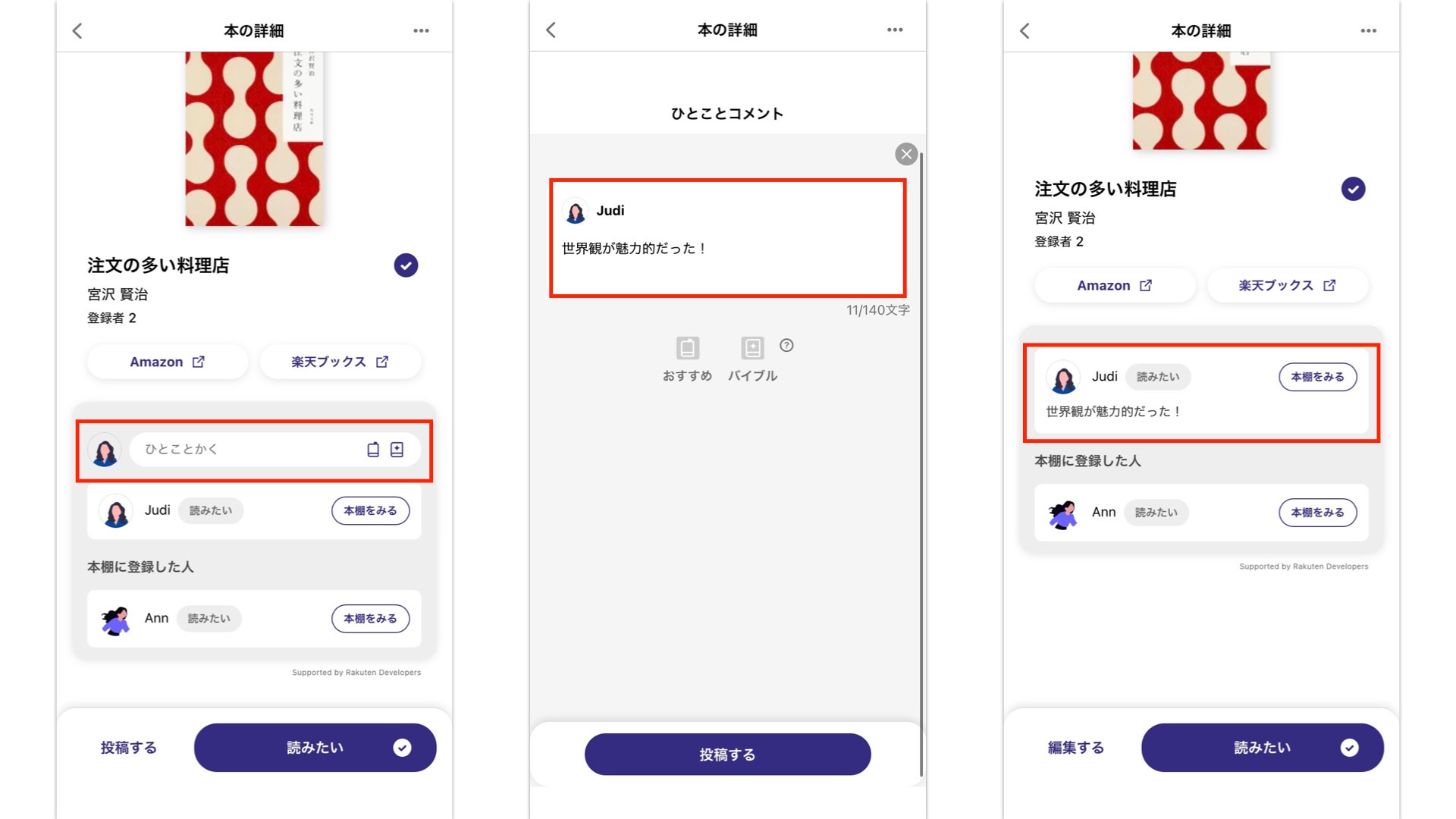 本の詳細ページにある「ひとことかく」の欄に入力し「投稿する」ボタンを押すと登録した本に対してコメントを残すことができます。
