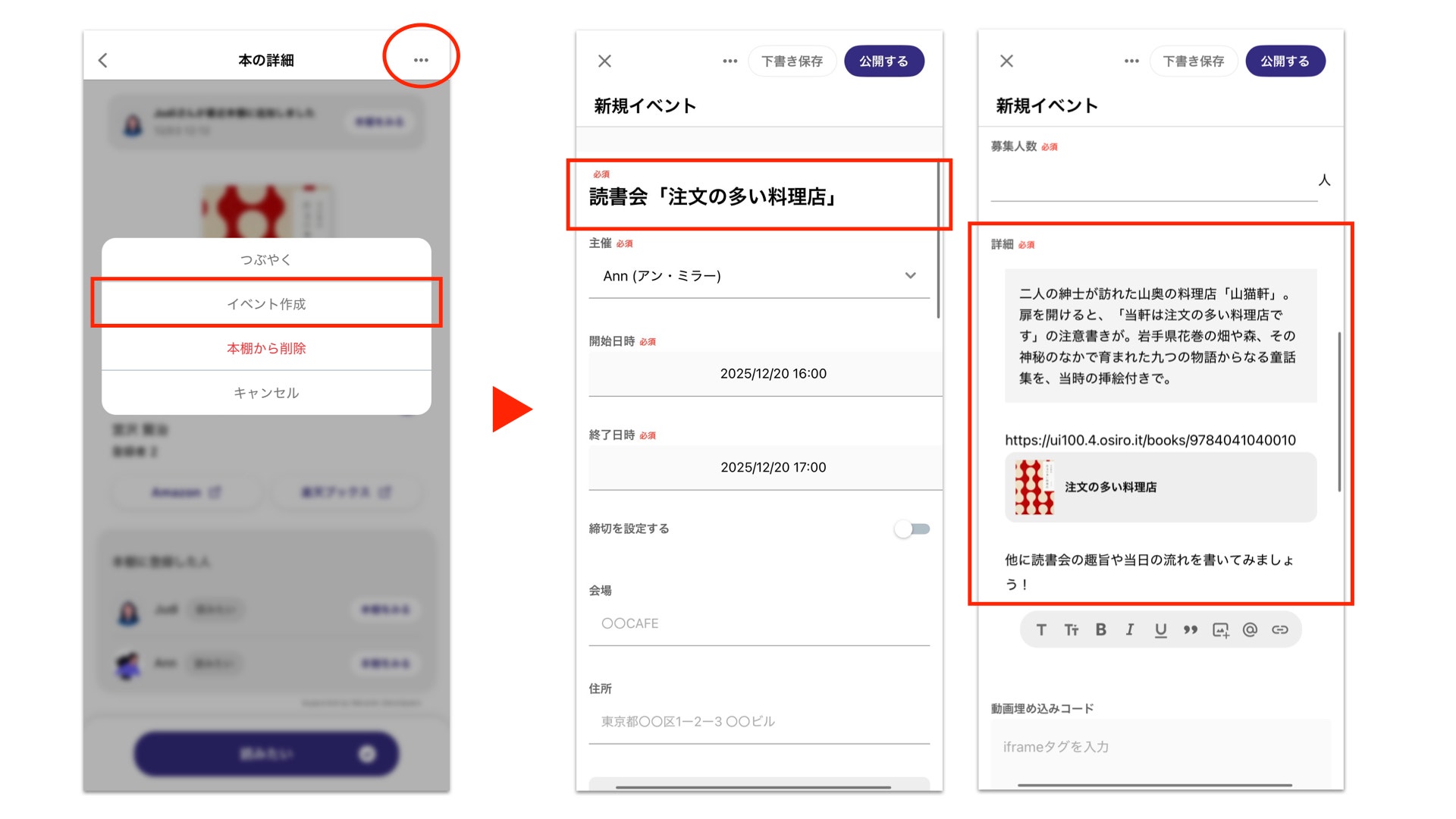 本の詳細画面右上にある三点リーダーから「イベント作成」を押すと、イベント作成ページに遷移されます。