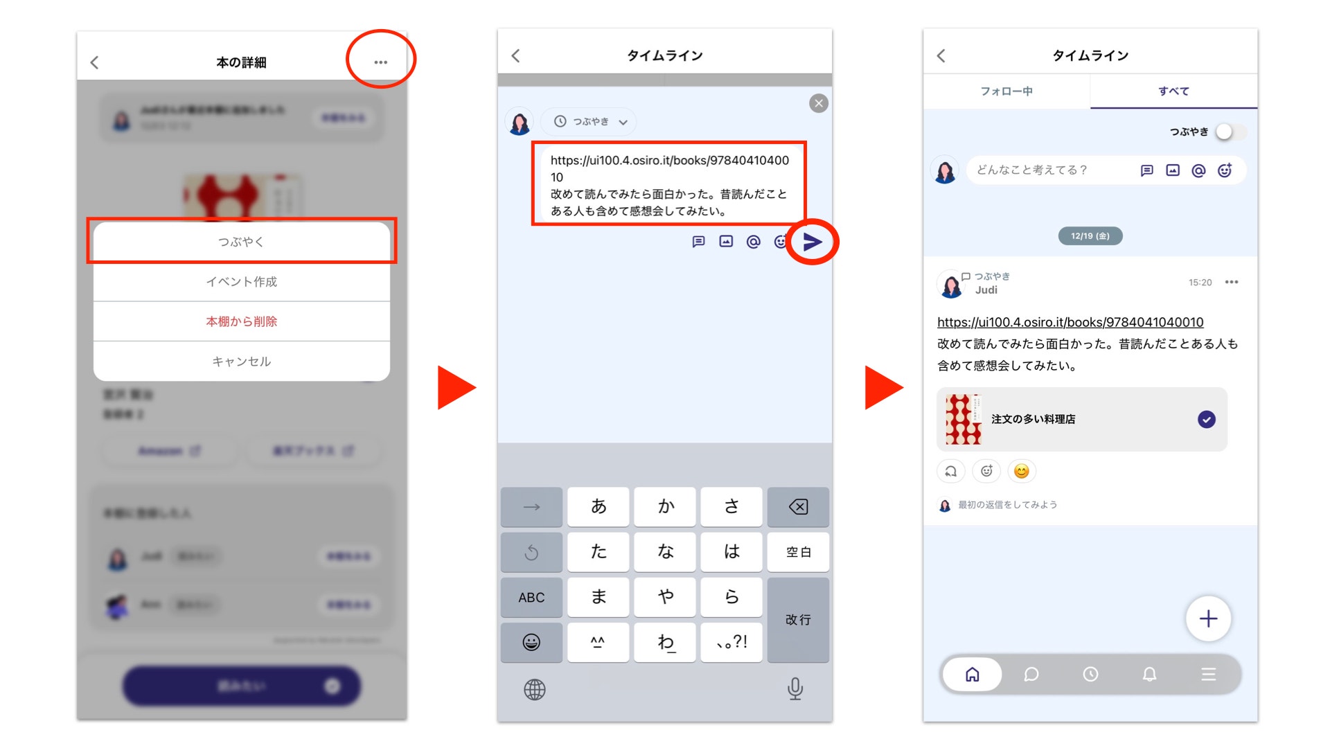 本の詳細画面右上にある三点リーダーから「つぶやき」を押すと、つぶやき画面の投稿に遷移されます。