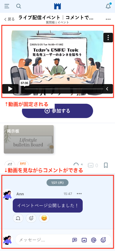 例えば、ライブ配信をしながらイベントページにコメントをしてもらいたい時、配信を視聴しながらコメント投稿ができるようになります。