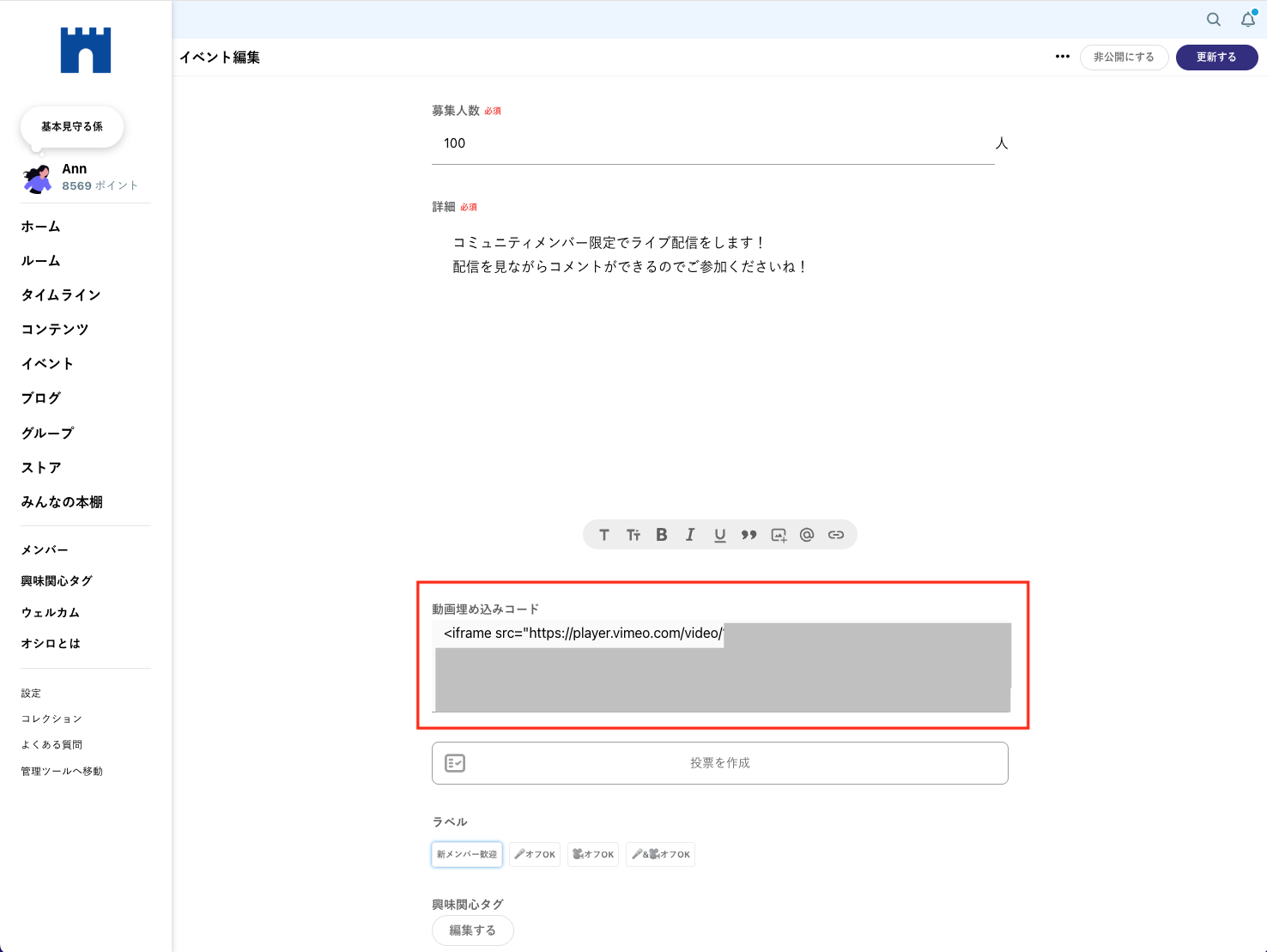 埋め込みたい動画の埋め込みコード(iframeタグ)をイベントページ作成画面内にある「動画埋め込みコード」欄に入力をしてください。「公開する」を押すと、イベントページのサムネイルエリアに動画が埋め込まれます。