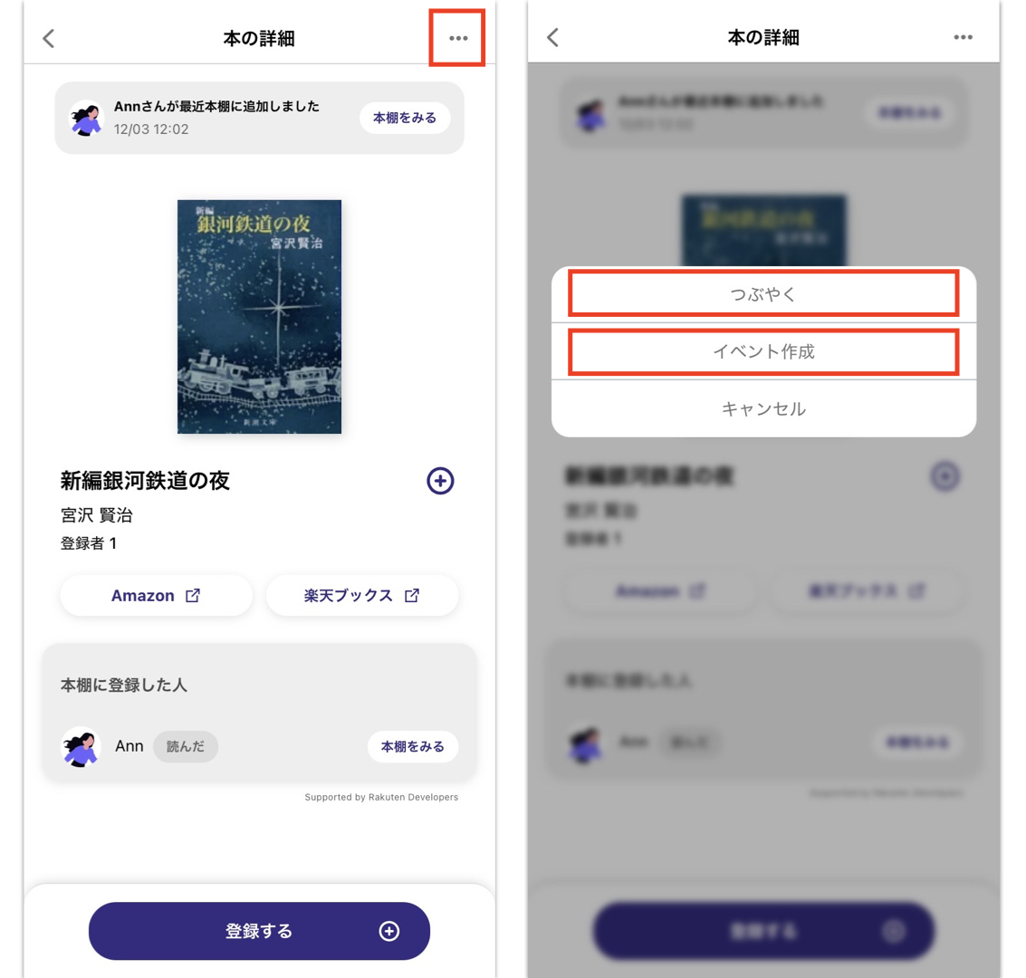 この度のリリースでブック登録をしていない書籍でも三点リーダーを押すことができ、イベント作成やリンクカードつきのつぶやきができるようになります。